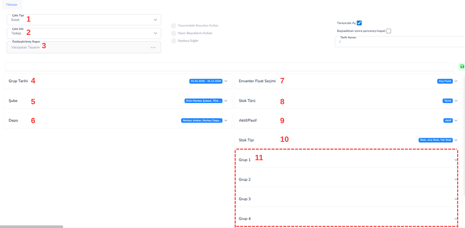 18. Gruplar (1-4): Stokların ait olduğu grup bilgilerine göre filtreleme yapılmasını sağlar. Raporlamada kategori bazlı ayrım için kullanılır.